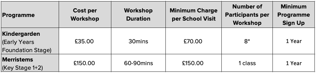 Our handy toolkits mean that we’re able to bring along almost all the materials needed for each workshop. The only materials we ask the school to provide are for the school’s garden creation- soil, vermiculite, bamboo and clay. (We can advise on exact products). Depending on the school’s size, this is an additional cost of approx £30/year.